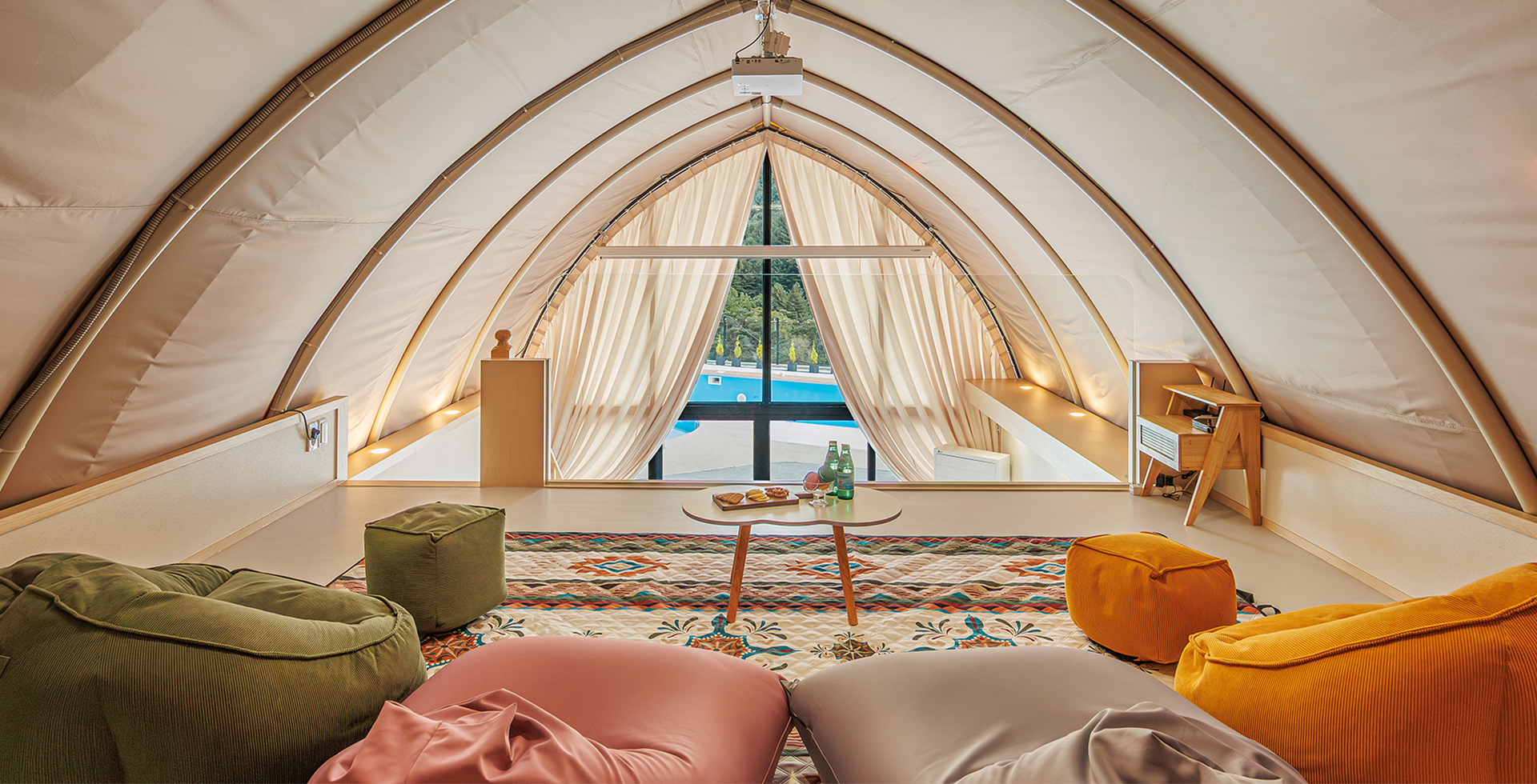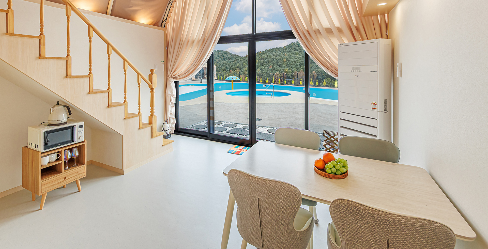 • 11평(36㎡), 독채복층, 침실1(퀸1 슈퍼싱글1) + 화장실1 + 주방 겸 거실(4인용 식탁) + 복층(빈백4)
