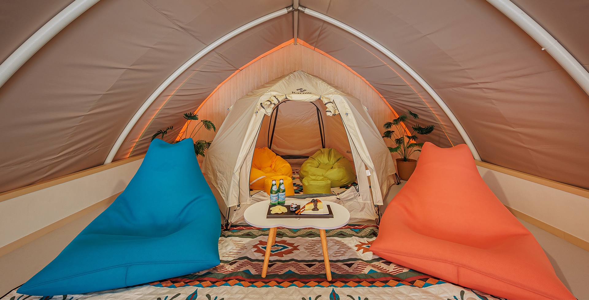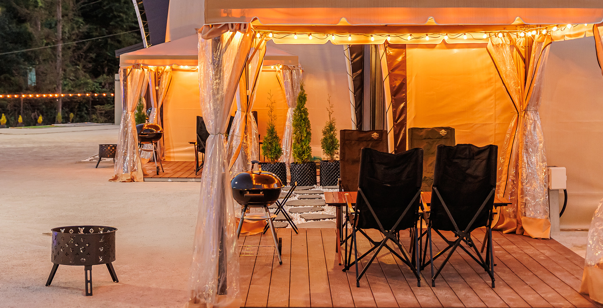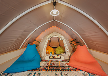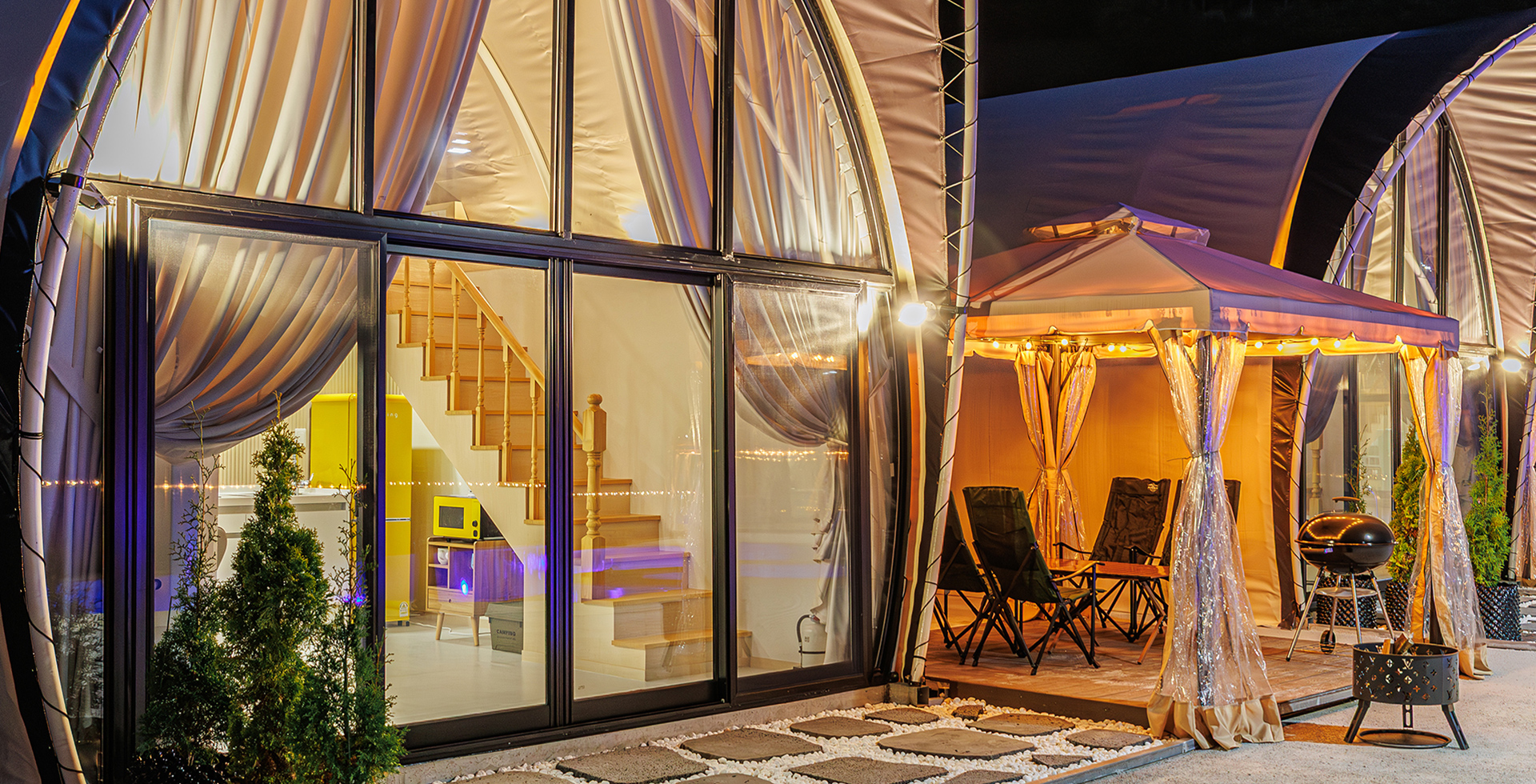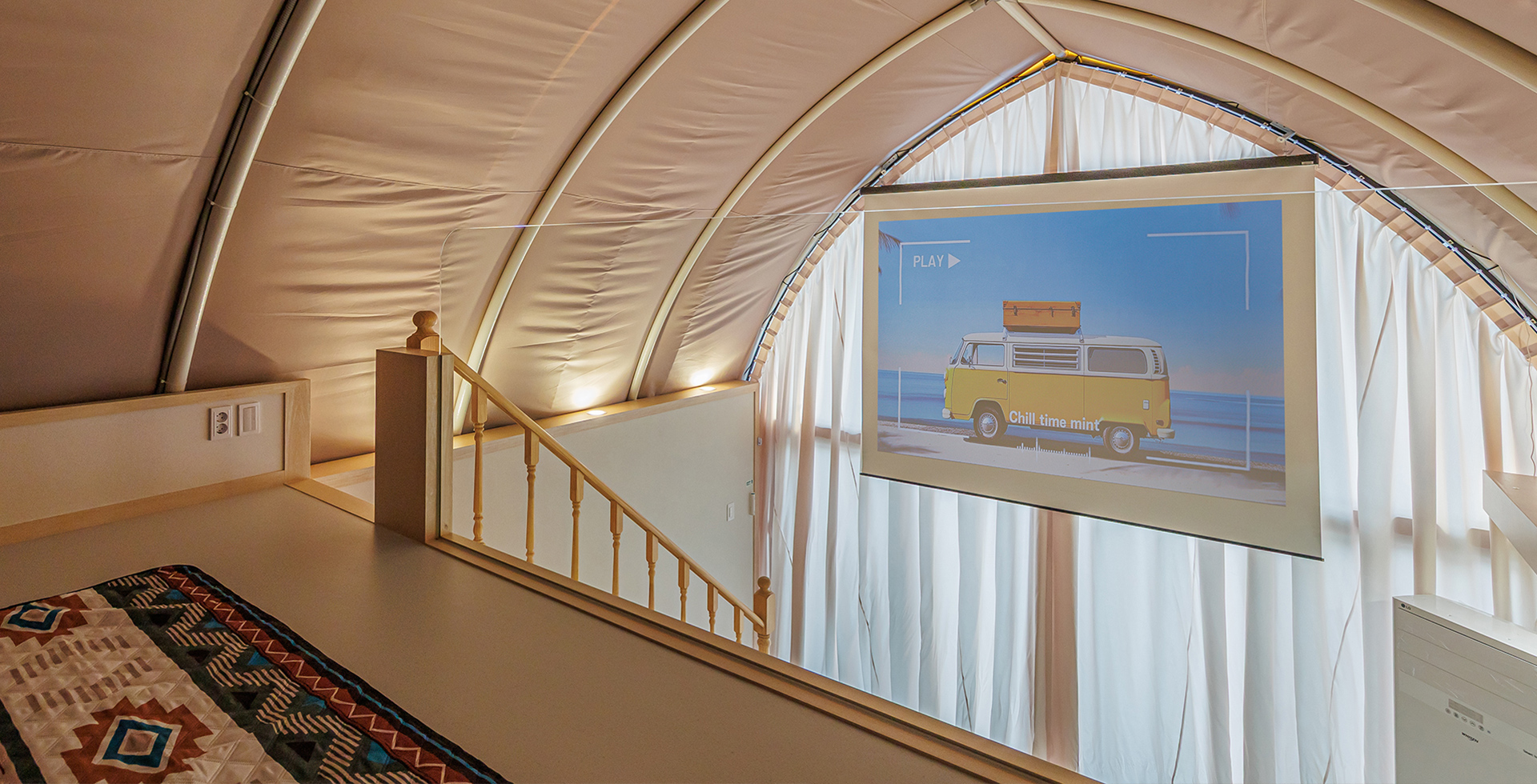 • 11평(36㎡), 독채복층, 침실1(퀸1 슈퍼싱글1) + 화장실1 + 주방 겸 거실(4인용 식탁) + 복층(텐트1,빈백2)