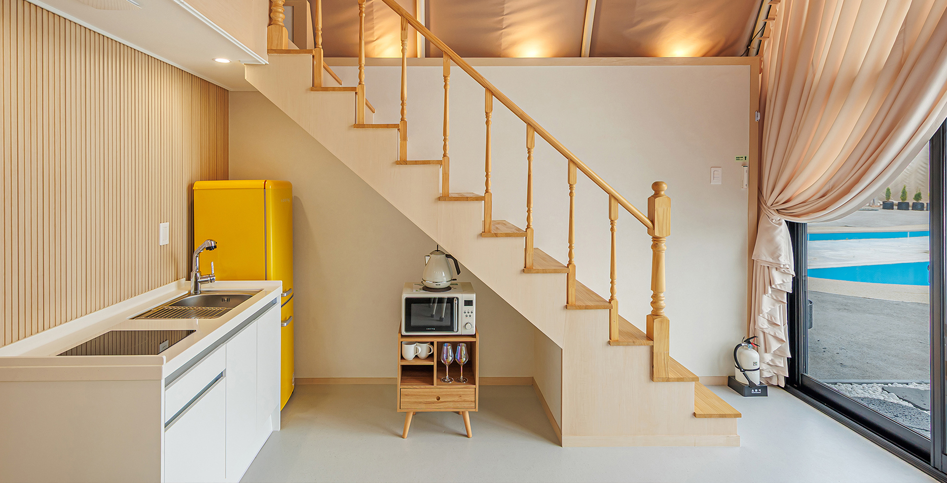 • 11평(36㎡), 독채복층, 침실1(퀸1 슈퍼싱글1) + 화장실1 + 주방 겸 거실(4인용 식탁) + 복층(빈백4)